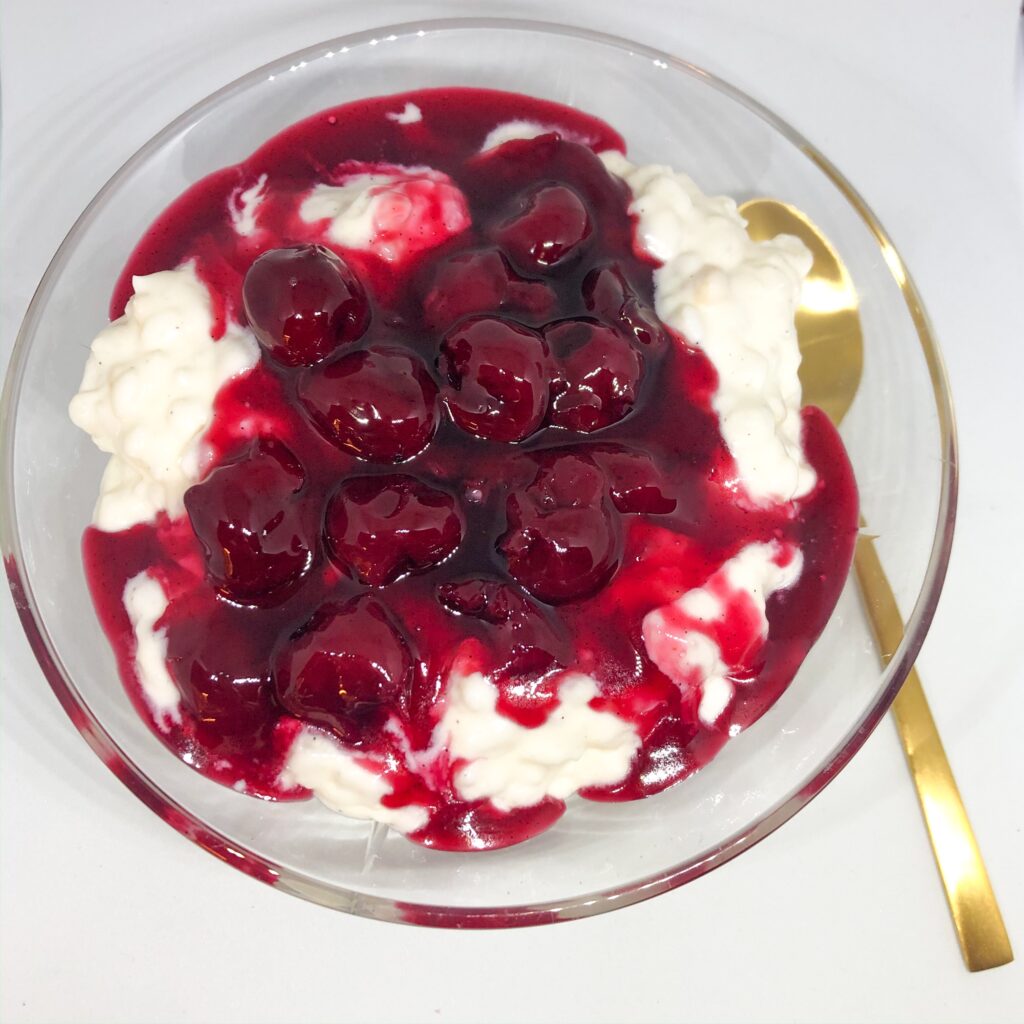 Ingen ris a la mande uden kirsebær sauce. Kirsebær sauce er utroligt nemt at lave selv, og tager ikke specielt lang tid. Der finde flere måder at lave kirsebær sauce på. Denne opskrift her er lavet med dessert kirsebær på glas. Jeg har købt mine i Rema 1000. Men du kan også lave dem med frosne eller friske kirsebær hvis du er så heldig at have sådan nogle. Det er jeg desværre ikke, og derfor bliver det med dessert kirsebær. Dessert kirsebær er kirsebær i en lage af vand og sukker. Jeg tilsætter både lidt portvin, vanilje og kanel til min kirsebær sauce. Men det er også muligt at undlade, hvis man er mere til den rene kirsebær smag. Men jeg synes at det giver et godt spild til ris a la mande.